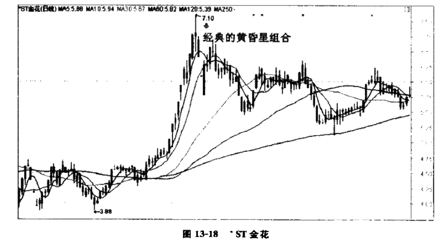 案例9* ST金花(600080)——-经典的黄昏星组合头部(见图13-18)。