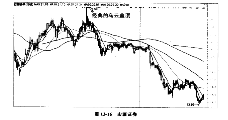 案例7宏源证券(000562)——经典的乌云盖顶头部(见图13-16)。