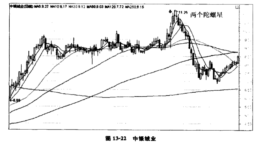 案例13中银绒业(000982)———两个陀螺星上涨受阻组合头部(见图13-22)。