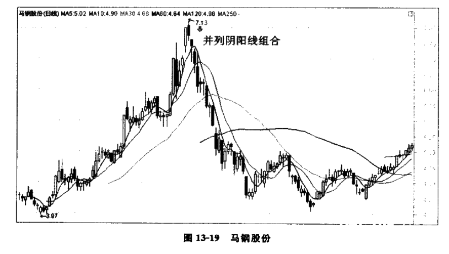 案例10马钢股份(600808)——并列阴阳线组合头部(见图13-19)。