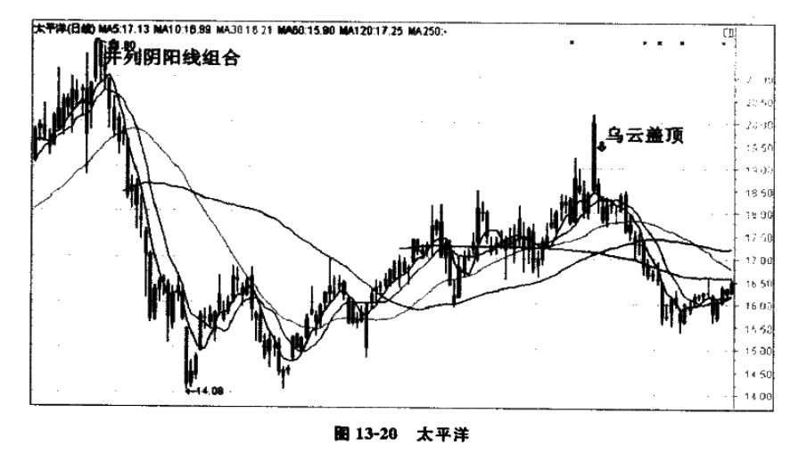 案例11太平洋(6oio99)—并列阴阳线组合和乌云盖顶头部(见图13-20)。