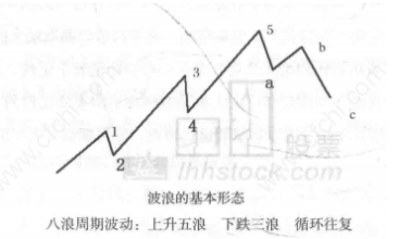 美国证券分析家拉尔夫纳尔逊艾略特利用道琼斯工业指数平均作为研究工具,发现不断变化的股价结构性形态。根据这一发 现他提出了一套波浪理论,这就是艾略特波浪理论。该理论是股票技术分析的一种理论, 认为市场走势不断重复一种模式,每一周期由五个上升浪和三个下跌浪组成,一个循环为八浪,即八浪循环。如图: