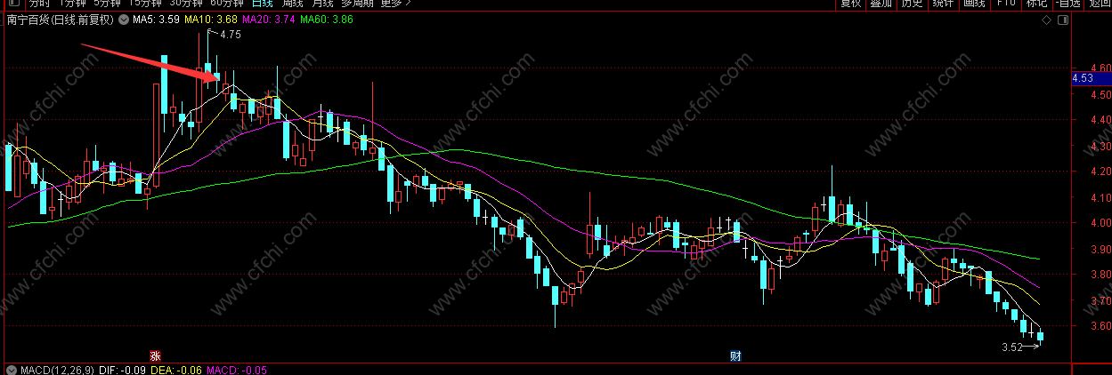 跌破均线说明股票已经出现买卖分歧,趋势向上困难。如下图南宁百货。跌破后各种下跌,不可收拾。