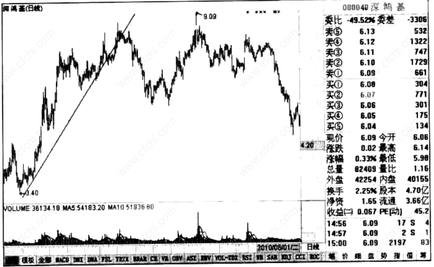 当后-波峰低于前一 -波峰,后-波谷低于前一波谷时,我们就称该趋势为下跌趋势。工商银行的走势图在图中方框处为波峰,圆圈处为波谷,这样的趋势就是下跌趋势。