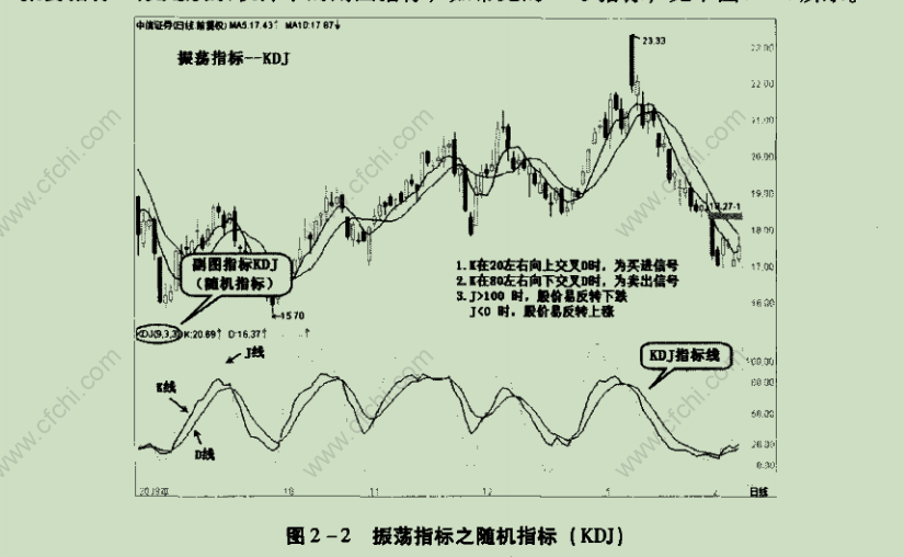 振荡行情是指明显的单边行情之外的市场运行区间,其往往是行情的调整区间或顶(底)部区间,如箱体振荡、“之”字形调整等。常见的振荡指标有,指数平滑异同移动平均线(MACD)、相对强弱指标( RSI)、随机指标(KDJ)等等,可以看出,振荡指标一般是股票软件中的副图指标,如常见的KDJ指标,见下图2-2所示。