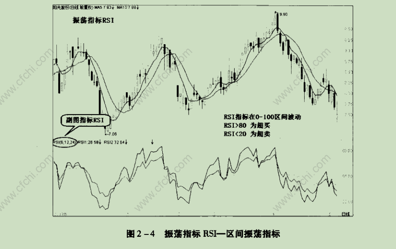 相对强弱指标(RSI)就是一个典型的区间振荡指标,如下图2-4所示。从图中可以看出,RSI指标数值是在0-100间波动,不会超过这个范围,而其中大部分时间数值是在20-80间波动。