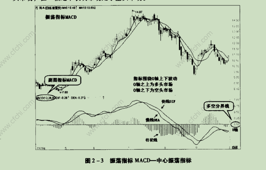 中心振荡指标是指标值围绕某个数值为中心上下波动的指标,指数平滑移动平均线(MACD)指标就是一个以0轴为波动中心的振荡指标,如下图2-3所示。从图中可以看出指标值是围绕О轴上下波动的。MACD 指标用在不同指数和个股中,MACD 的取值范围不同,这是因为MACD指标是根据收盘价计算出来的长期与短期指数平均线的差值,指标数值受收盘价高低的影响。用在高价股上指标最大值可能大于3,用在低价股上指标最大值可能小于1,不同个股的数值的比较没有意义,只需要和个股自身的历史数值进行对比,来判断上涨或下跌的强弱。但0轴对所有个股和指数都有相同的意义,它是多空的分界线。指标线在0轴之上表明市场处于多头市场,在0轴之下表明市场处于空头市场。