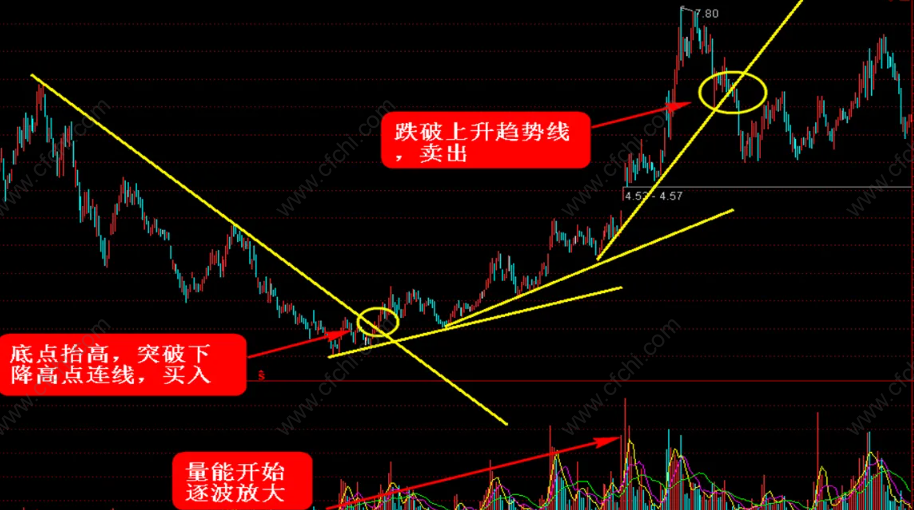 指标趋势可以通过趋势线来表示,上升趋势线是连接最近的两个或两个以上波谷的直线,下降趋势线是连接最近两个或两个以上波峰的直线。