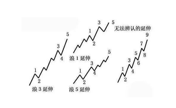 3浪延长浪:这种情况股市居多,3浪是主浪中最长的一浪,这个时候市场信心还没完全恢复,波动比较激烈,最容易出现延长浪。