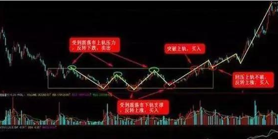 5、受到震荡市上轨压力,反转下跌,卖出;受到震荡市下轨支撑,反转上涨,买入;突破上轨,买入;回压上轨不破,反转上涨,买入: