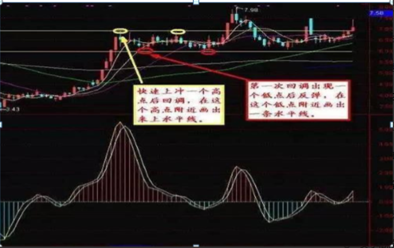 二、画两条辅助线画出来两条辅助线,这两条线的重要性不用我讲了,用起来您就知道了,不画这两条线,无从谈波段操作。画法如上图,画法很简单,千万不要画错。