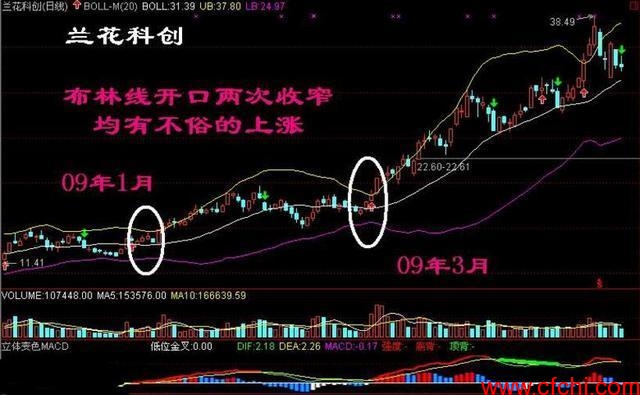 (6)最佳的买入时机是在股价放量向上突破,布林线指标开口扩大。