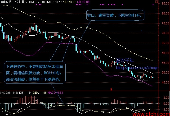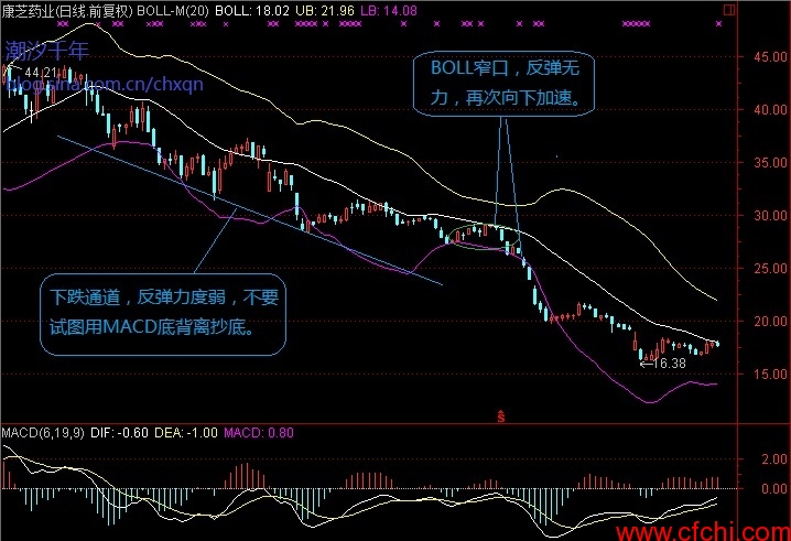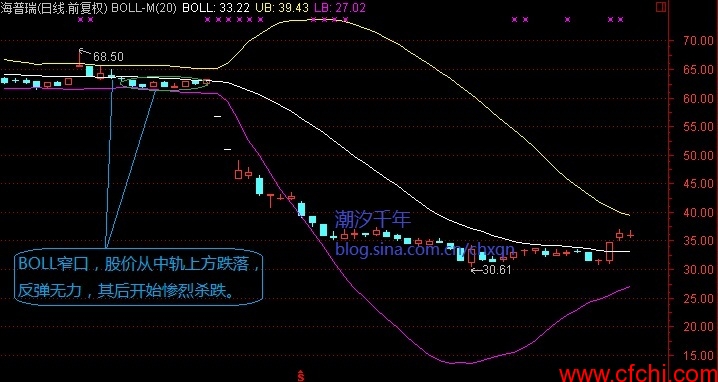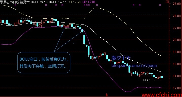 具体形态就是:股价横盘震荡,BOLL呈窄口,之前股价在中轨之上,其后跌至中轨下方,在下轨得到支撑,但反弹力度很弱,不能反弹回中轨上方,横盘数天后,突然向下突破,跌穿BOLL下轨,此后BOLL开口,往往会形成一波很大的杀跌。
