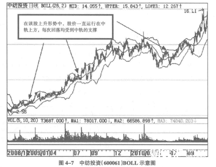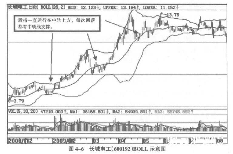 从2008年11月5日一直到2009年6月1日,股指一直运行在BOLL中轨的上方,每次回落(图4-6中箭头所指处)也均受到BOLL中轨的支撑。