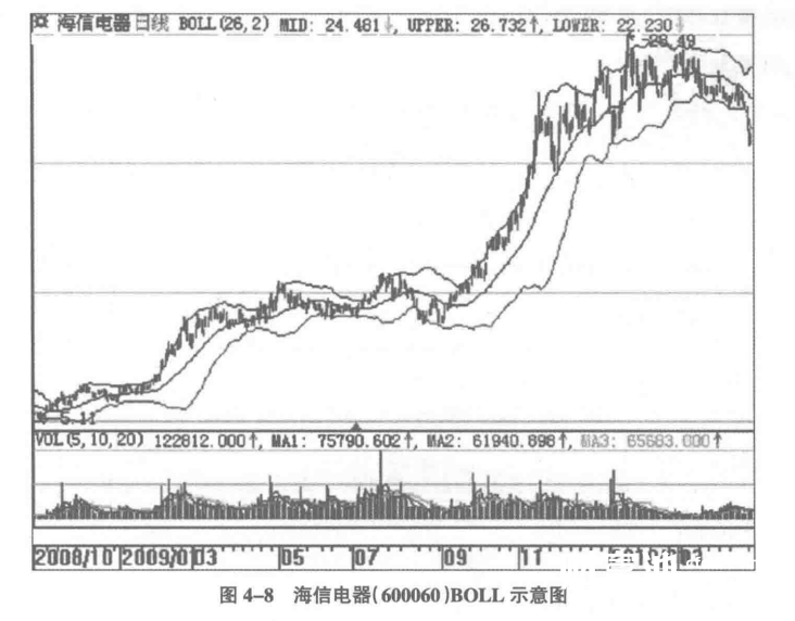 从2008年10月31日一直到2010年1月20日,海信电器一直运行在 BOLL中轨的上方,每次回落(图4-8中箭头所指处)均受到中轨的支持。从2008年10月31日一直到2010年1月20日,该股股价上升将近30倍。