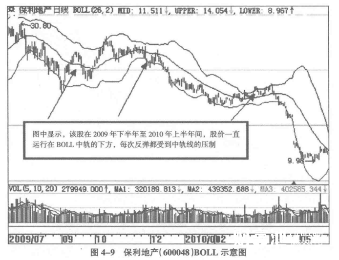 保利地产(600048)于2009年7月24日至2010年5月18日,长达一年多的时间内,一直处于下跌状态,且在此状态内,该股股价一直运行于BOLL指标的中轨线之下,每次反弹都会受到中轨线的压制(图4-9中箭头所指处),转而又向下运行。从2009年7月24日至2010年5月18日这段时间内,该股跌幅达11%。