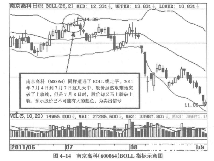 南京高科(600064)同样是在BOLL线走平的情况下,虽然在2011年7月4日到7月7日连续突破了上轨线,股价有所上扬,但是由于上轨的压力,并没有掀起大的波澜,旋即又跌破上轨,此时需及时卖出止损。