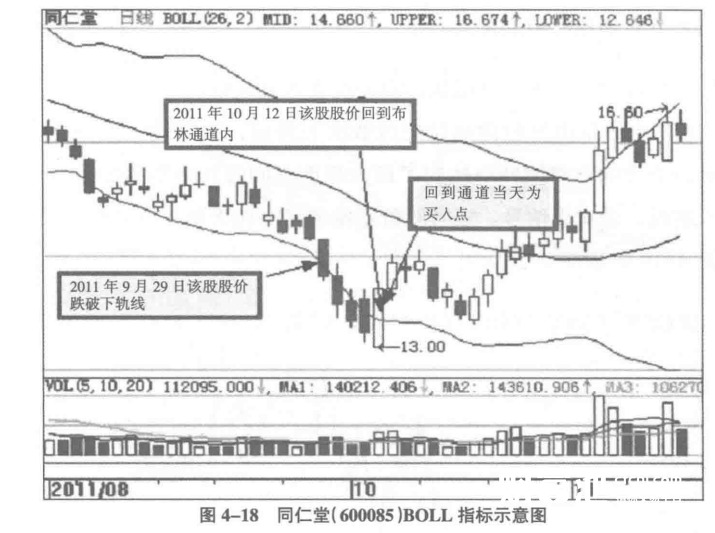 这里同样分两种情况说明:一是当下轨对股价构成明显的支撑作目时,投资者需要在这种支撑作用生效时买入该股;二是股价突破下九线后,再次回到布林通道内时,可以买入。