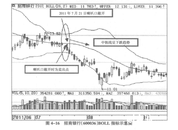 从图4-16我们可以看出,招商银行(600036)在2011年7月21日当天,BOLL指标出现了喇叭口形态,同时中轨线又出现了轻微的下跌,代表当前市场处于下跌的行情中,未来上涨的空间不大,投资者需要尽快将手中的股票卖出。