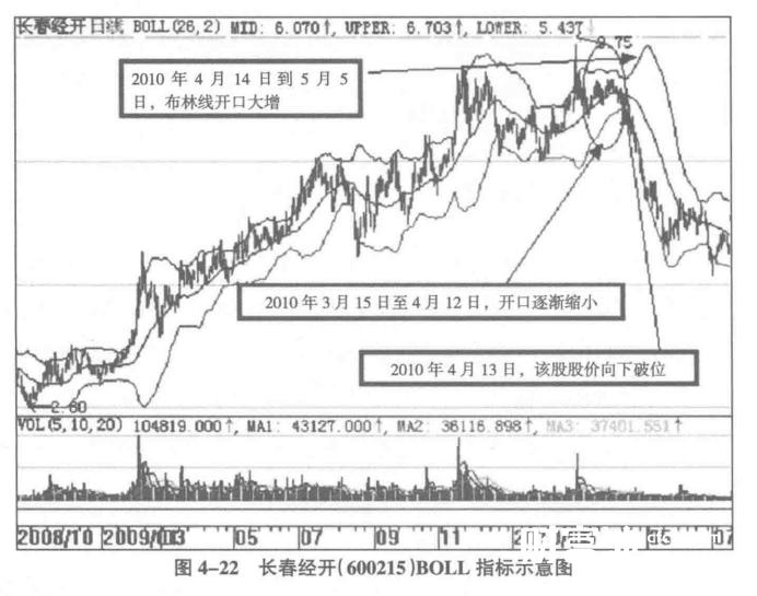 (2)若布林线在高位开口极其窄小,这时股价向下破位,布林线开口增大,那么将会开始一轮下跌趋势。