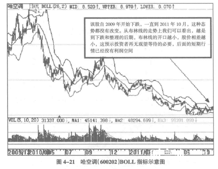 (1)股价在数波下跌之后,通常紧接着将出现长时间窄幅整理时期,这时我们看到布林线上限以及下线空间极小,越来越近、越来越窄。在盘中的股价最高价和最低价之间相差很小,短线没有利润空间,常会连手续费都挣不到。