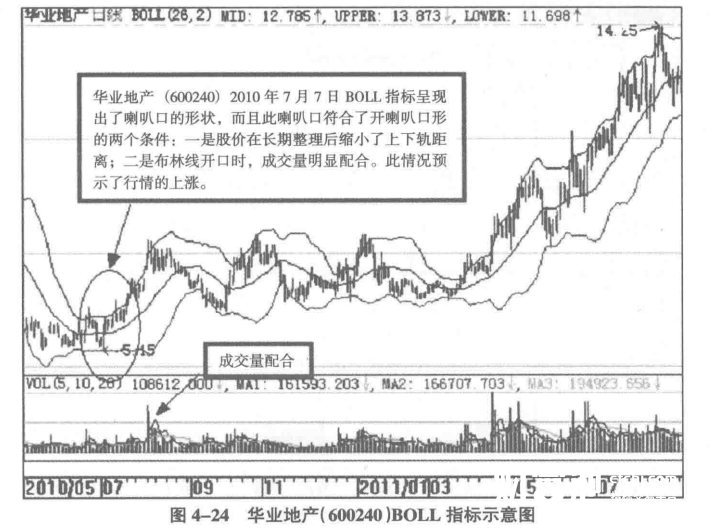 开口型喇叭口的形态形成需要具备以下两个条件:第一个条件是股价在长时间中低位横盘整理,整理时间长导致上下轨之间距离小,以及未来行情上涨的幅度大;第二个条件就是布林线开始开口时,需要明显的成交量配合,如图4-24所示。