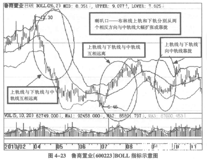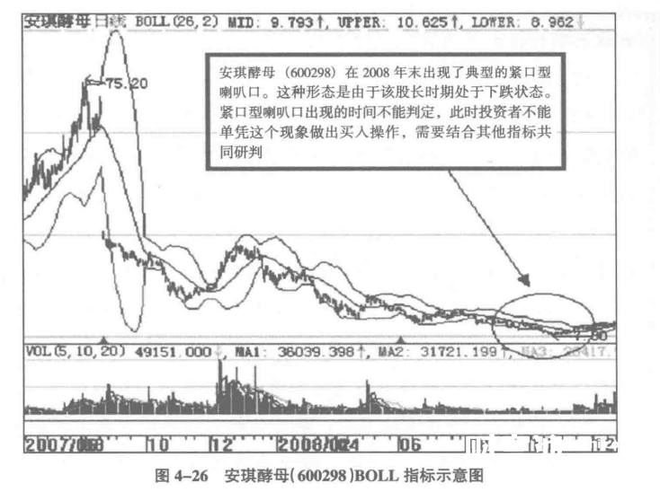 所谓布林线“喇叭口”是指在股价运行的过程中,布林线的上轨线和下轨线分别从两个相反的方向与中轨线大幅扩张或靠拢而形成的类似于喇叭口的特殊形状。
