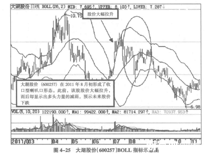 股价在长时期底部整理以后,布林线上下轨线之间逐步收缩,上下轨线之间距离逐渐减小,成交量逐渐配合增大,股价勐然开始向上急速上涨的行情,这时布林线上轨线也出现急速上升,下轨线则向下加速运行,这样的布林线上下轨道形成了一个和大喇叭相似的形态,我们把布林线这种大喇叭口称为开口型喇叭口。