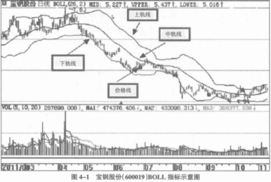 布林指标和麦克指标都属于路径指标,股价波动处于上限和下限之间区域时,这条带状区宽窄跟随着股价波动而改变宽窄,股价波动较大时,带状区变宽;股票波动较小时,带状区变窄。在大智慧股票分析软件中,BOLL指标总共是通过四条线组成的,也就是上轨线UP、中轨线MID、下轨线 LOW以及价格线所组成。其中这四条线都使用不同颜色的线条来表示,分别为:蓝色线、赭石色线、白色线、紫色线,如图4-1所示。