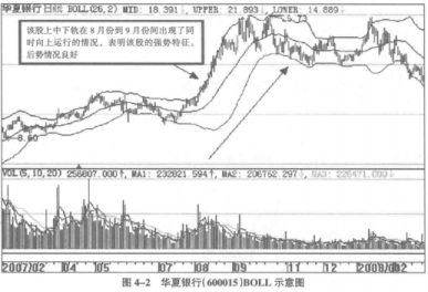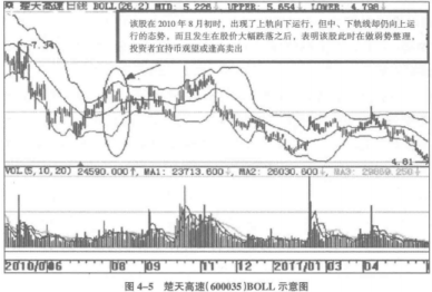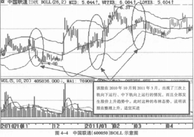 如图4-2所示,BOLL指标中的上轨就是布林线中最上方运行的线路;中轨就是中间运行的线路;下轨就是在最下方运行的线路。我们应用BOLL技术指标,其中最简单易行的一项就是观察上轨、中轨、下轨线路的走势以及三者形成的态势关系,以此来判断该股的基本走势以及买卖信号。这里我们分为五种情况说明: