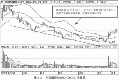 (2)在股票的布林线上中下轨线同时出现向下运行时,说明股价弱势特征极其明显,股价将会在未来短期内持续下跌,投资者应当持币观望或逢高出货,如图4-3所示。