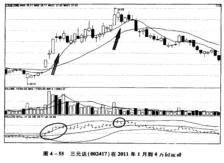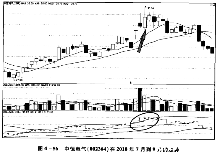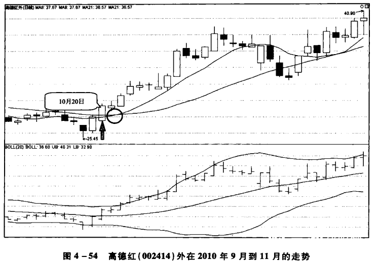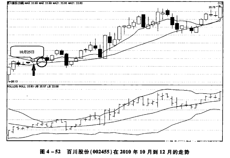 从2010年10月18日到27日这段时间,布林线通道逐渐收缩,10月25日,股价站上21日均线,10月27日,8日均线上穿21日均线,布林线开口也急剧缩小。