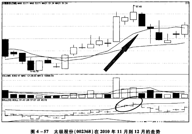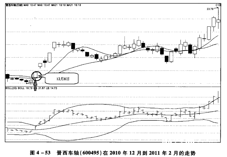 在2010年12月1日到8日这段时间,布林线通道逐渐收缩,12月8日这一天,股价站上21日均线,同时8日均线上穿21日均线,在这个时候,布林线开口也迅速收紧,这种情况往往是一个不错的买入时机。