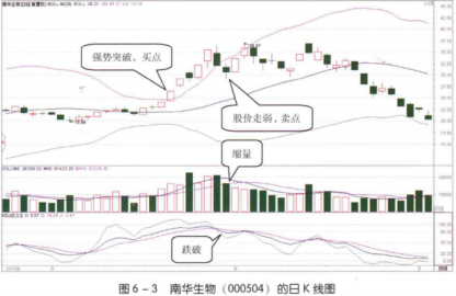 如图6-3所示,2015年5月21日,南华生物(000504) 股价大幅上涨,突破BOLL指标上轨。同时,其BOLL指标开口逐渐打开,成交量大幅放大,KDJ指标中的指标线K突破80,指标线J突破100。这些信号都说明该股已经进入了强势上涨的趋势中,短期内将会大幅上涨。此时投资者可以积极买入股票,进行短线操作。
