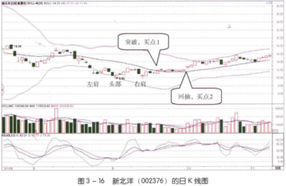 如图3- 16所示,2015 年8月底至9月,新北洋(002376) 股价下跌至底部后,形成左右两边较高、中间较低的连续三个底部,组成头肩底形态。这样的形态说明该股即将见底反弹,是看涨买入信号。