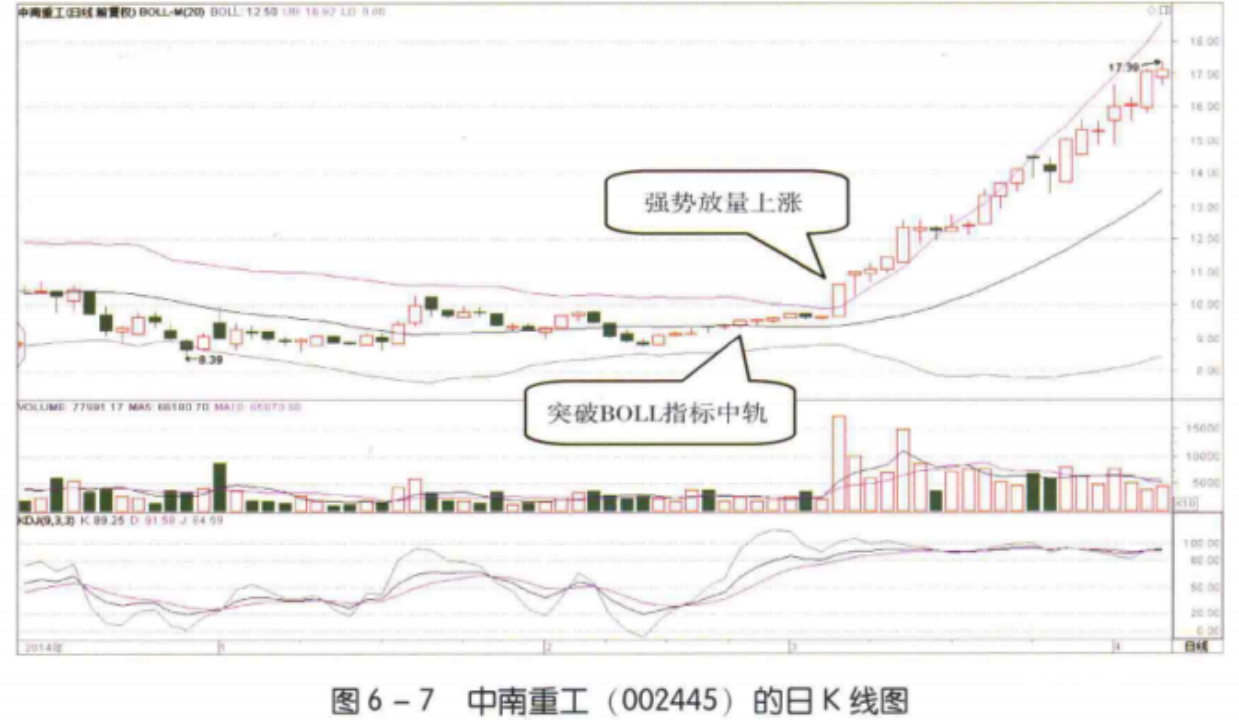 如图6-7所示,2015年1月至2月,中南重工(002445) 股价在BOLL指标上轨和下轨之间反复震荡。2月25日,股价再一次突破BOLL指标中轨。随后,经过小幅上涨后开始回落。
