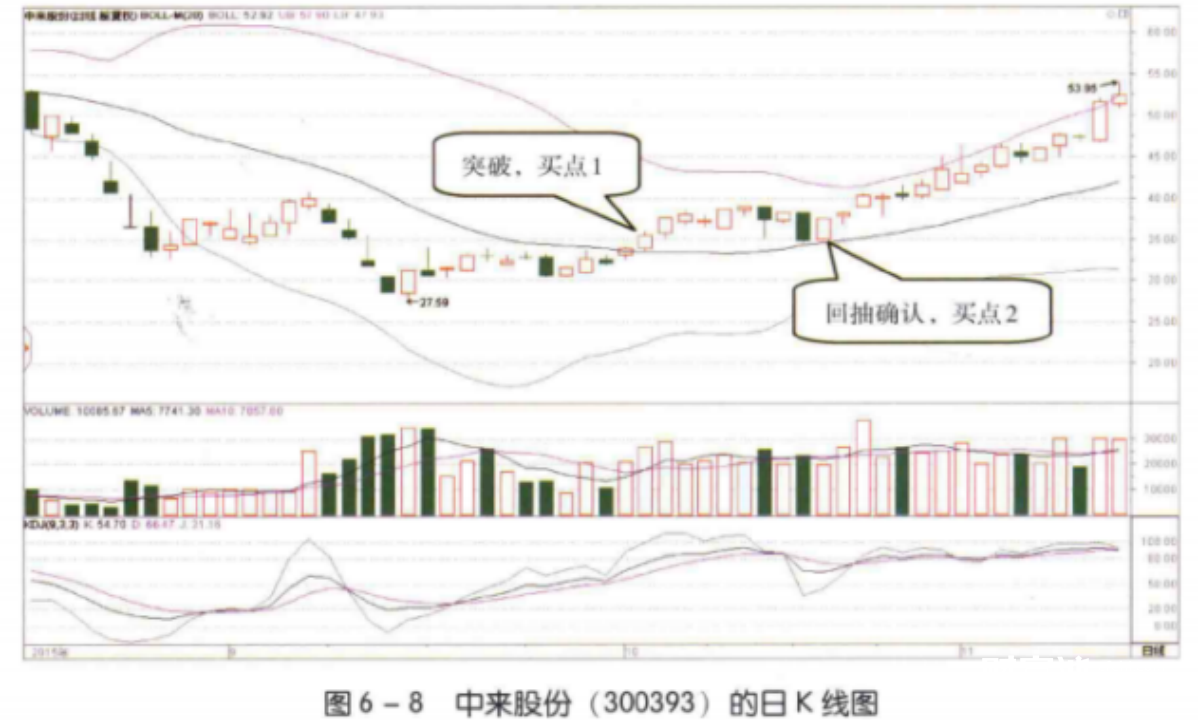 如图6-8所示,2015 年9月,中来股份(300393) 股价一直在其BOLL指标下轨持续下跌。10月9日,股价突破BOLL指标中轨。这样的形态说明上涨行情开始,此时投资者可以积极买入股票。
