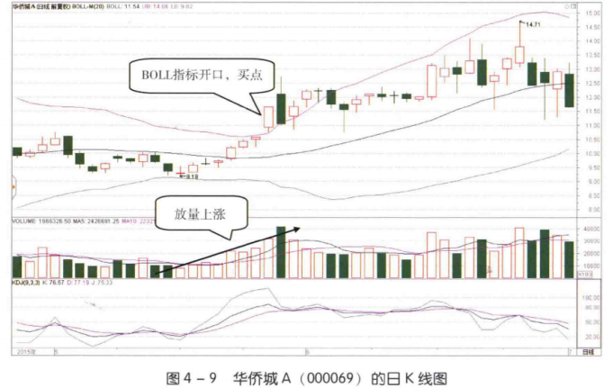 如图4-9所示,2015 年5月底,华侨城A (000069) BOLL 指标的上轨向上移动,下轨向下移动,形成了开口形态。在开口形态出现之前,该股股价刚刚突破BOLL指标中轨并持续上涨。
