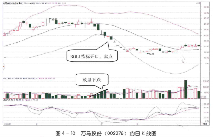 如图4-10所示,2015年6月底,万马股份(002276) BOLL 指标的上轨向上移动,下轨向下移动,形成了开口形态。在开口形态形成的同时,该股的股价刚刚跌破BOLL指标中轨并持续下跌,成交量也持续放大。这些形态都说明此时市场上正在有大量投资者抛出股票,是未来股价会持续下跌的信号。看到这样的信号后,投资者应该尽快卖出手中的股票。