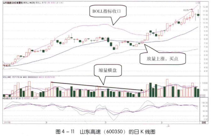如图4- 11所示,2015年4月至5月,山东高速(600350) 股价上涨至高位后持续横盘整理。在整理过程中,该股BOLL指标上轨逐渐向下,下轨向上,形成了收口形态。同时,其成交量也逐渐萎缩。这些形态都说明股价进人横盘整理行情中,市场上的交易越来越冷清。