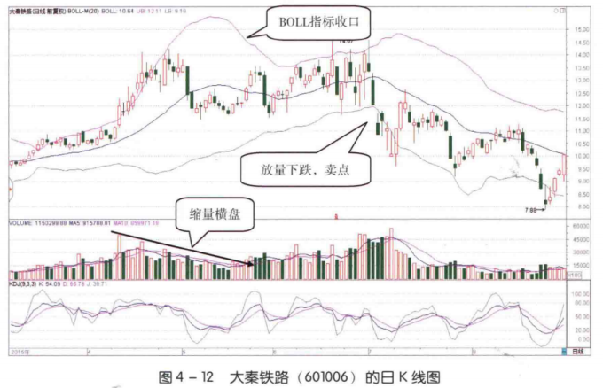 如图4-12所示,2015年4月至6月,大秦铁路(601006) 股价上涨至高位后开始在高位持续横盘整理。在整理过程中,其BOLL指标逐渐收口,成交量也持续萎缩。在这个过程中,投资者应该冷静观望后市,不要盲目买入或者卖出股票。