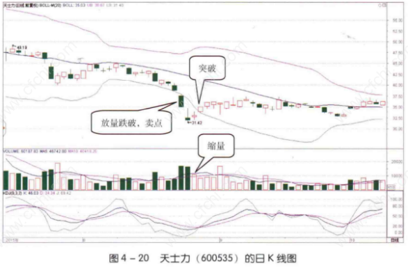如图4-20所示,2015年8月24日,天士力(600535) 股价强势下跌,跌破BOLL指标下轨,同时当日的成交量也大幅放大,明显超过前期的成交水平。