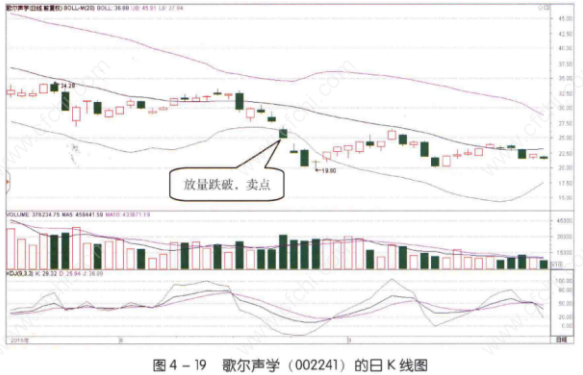 如图4-19所示,2015年8月24日,歌尔声学(002241) 股价强势下跌,跌破BOLL指标下轨,同时当日的成交量与前段时间相比也大幅放大。这样的形态说明市场上有大量投资者正在抛出股票,股价受到强势打压将在短期内大幅下跌。看到这样的形态时,投资者应该尽快卖出手中的股票,回避风险。