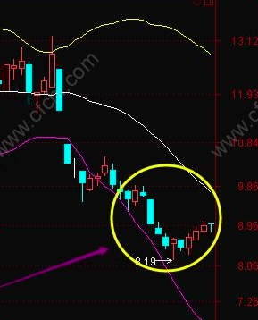 股价强势下跌两个交易日后获得支撑,成交量也回到了正常水平。三个交易日后,股价重新突破BOLL指标下轨,回到BOLL通道内部,这是强势下跌行情已经结束的信号,但是此时投资者不应该急于买入股票。在这之后,该股股价进入了持续的底部整理行情中。