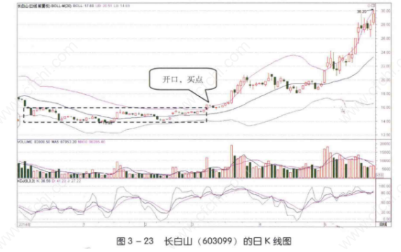 如图3- 23所示,2015年1月至2月,长白山(603099) 股价在横盘整理过程中,进入了一段上有阻力、下有支撑的矩形区间。在这个过程中,其BOLL指标的上轨和下轨也逐渐收敛起来。