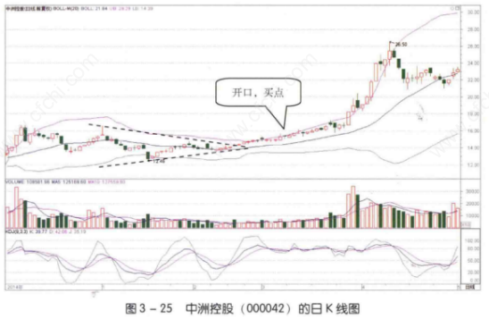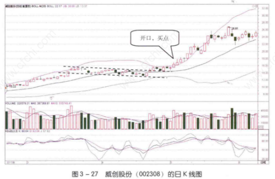 在这样的三角形整理过程中,该股BOLL指标形成了收敛的形态。2月底,该股BOLL指标的上轨开始向下移动,下轨向上移动,形成开口的形态。同时,其股价也在BOLL指标上轨上方持续上涨。这样的形态说明市场上有新的多方力量进入,正在将股价强势向上拉升。看到这样的形态后,投资者可以积极买人股票。