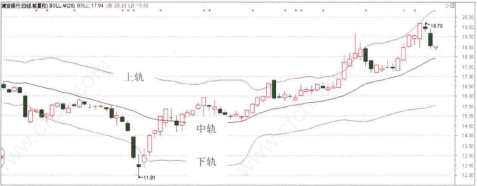 BOLL指标与股票K线走势图在一起显示,由三条曲线组成,这三条曲线永远不会相交,自上而下分别称为上轨、中轨和下轨,如图BOLL指标的三条曲线所示。