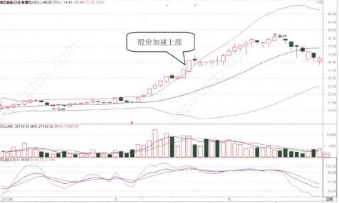 2015年5月,海欣食品(002702)经过横盘整理后,开始加速上涨。在上涨过程中,其股价上涨的速度越来越快。受到这次上涨行情影响,其BOLL指标中轨持续上涨,并且中轨和上轨之间、中轨和下轨之间的距离越来越大。