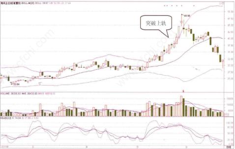 2015年2月至4月,海洋王(002724)股价在持续震荡涨跌的过程中一直在BOLL通道的内部运行,并且多次在BOLL指标下轨附近获得支撑,或者在BOLL指标上轨附近遇到阻力。直到5月后,股价持续强势上涨。在这种情况下,该股才强势突破了BOLL指标上轨,开始持续上涨。