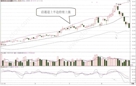 在这个过程中,股价能够一直保持在BOLL指标中轨以上,说明整个市场持续上涨,处于上涨趋势中。而股价上涨又不突破BOLL指标上轨,则说明股票没有出现短期内过度强势的上涨行情,整个上涨趋势十分稳健,这样的稳健上涨趋势往往能够持续比较长的时间。